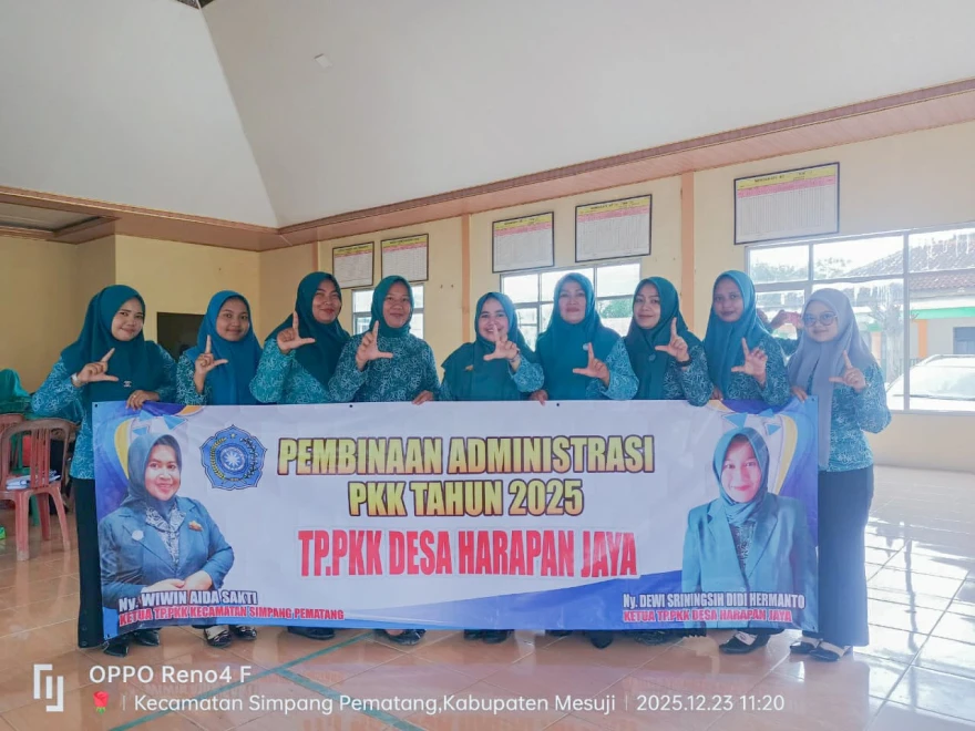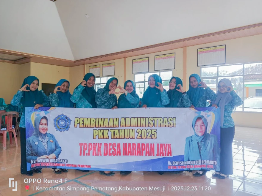 Selasa 23 Desember 2025 // TP PKK Desa Harapan Jaya Ny Dewi Sriningsih menghadiri Rapat Pembinaan Administrasi PKK Tahun 2025. Dalam rangka pembentukan administrasi yang terencana dan tersusun dengan baik. ketua pokja juga mengingatkan mengenai Fungsi Pokja PKK: