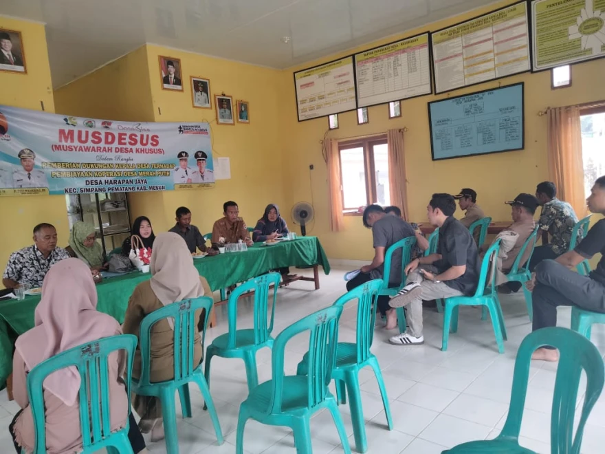Badan Pemerintah Desa (BPD) Harapan Jaya mengadakan Rapat Musyawarah Desa dalam rangka Pemberian Dukungan Kepala Desa Terhadap Pembiayaan Koperasi Desa Merah Putih. Yang di ikuti oleh Lemaga Desa Harapan Jaya, Perangkat dan masyarakat Desa Harapan Jaya. di dampingi oleh kepala desa, sekretaris camat, dan koordinator cabang kabupaten Mesuji.