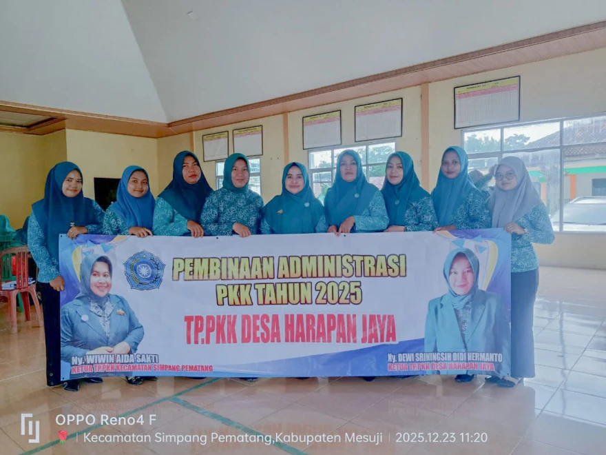 Selasa 23 Desember 2025 // TP PKK Desa Harapan Jaya Ny Dewi Sriningsih menghadiri Rapat Pembinaan Administrasi PKK Tahun 2025. Dalam rangka pembentukan administrasi yang terencana dan tersusun dengan baik. ketua pokja juga mengingatkan mengenai Fungsi Pokja PKK: